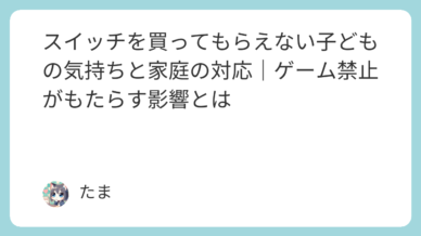 子ども スイッチを買ってもらえない子どもの気持ちと家庭の対応|ゲーム禁止がもたらす影響とは 子どもが「スイッチが欲しい」と言い出したとき、どう対応すべきか悩む親は多いものです。友達のほとんどが持っている中で、「うちはまだ早い」「買う予定はない」と伝えると、子どもが落ち込んだり、仲間外れを感じ... 2025.10.18 子ども